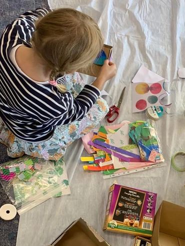 Each Creative Play Workshop starts with a 10-minute warm up activity to get the creative juices flowing. Following this the children work on the main craft for 30 - 40 minutes. Next, the children spend 40 minutes exploring the Creative Play 'stations'. These stations are a mix of process-based and product-based activities that take anywhere from 5 to 15 minutes to complete. In this time, the children are free to explore the stations which interest them. In the last 30 minutes the children complete their main craft before packing assisting to pack up.